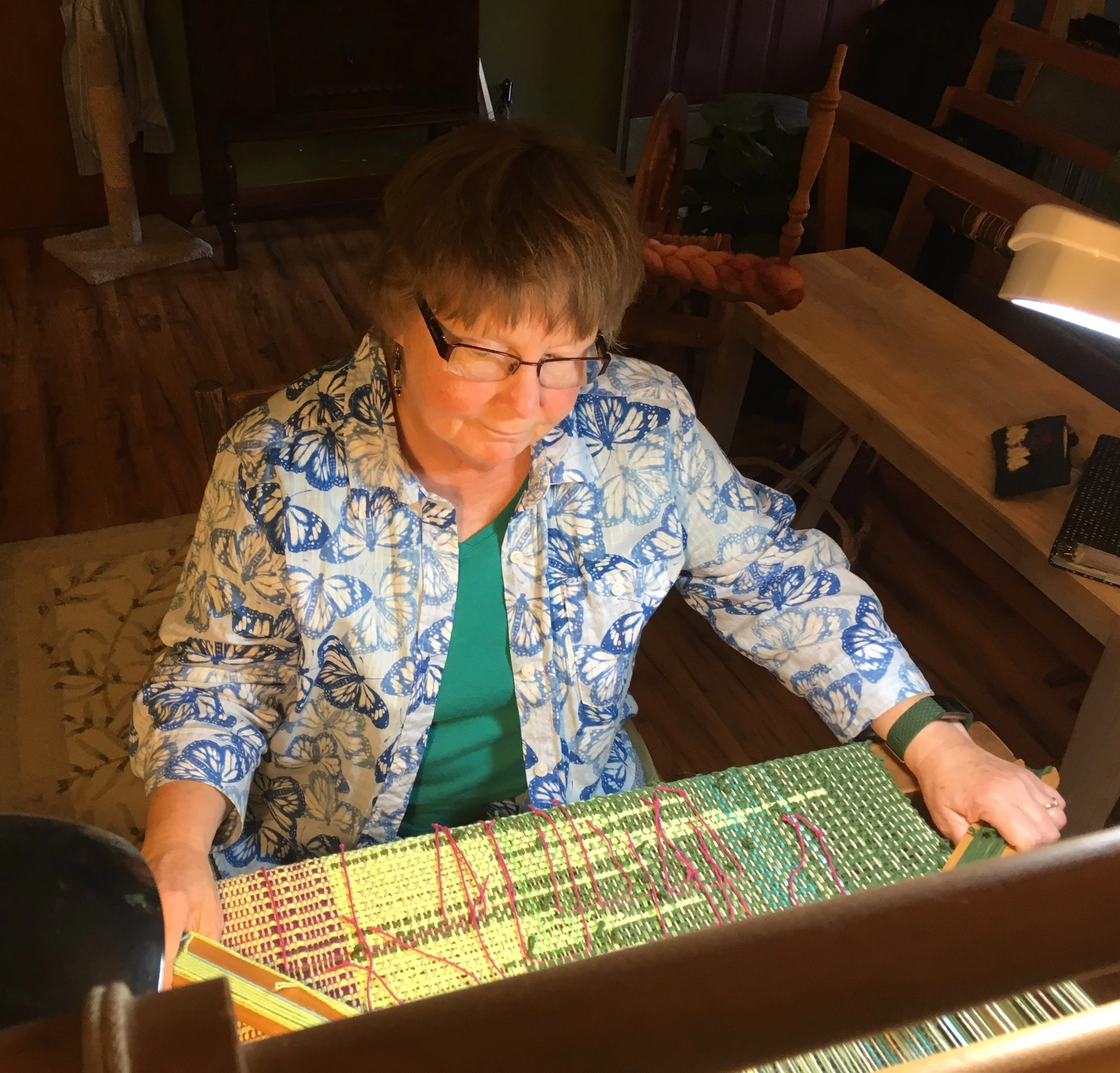 “Hi there, my name is Janet Griffin and I am a fiber artist. Specifically, I’d like to say I am a tapestry Weaver. I use a cotton warp background on my loom, and I inlay wool yarn to create an image. My Tapestry weavings are based on the techniques developed by Theo Moorman , based in England. Additionally, I find felted wool extremely creative. Felted paintings, felted bowls, felted flowers, felted purses work extremely well together. My favorite kind of fiber is Corriedale, Romney, and Merino wool or yarn, cotton yarns, Silk, Leicester locks , and Mohair. Feathers are kind of fun too. As you can tell I’m very much drawn into texture. I do love how wool can be soft and fluffy; and yet transformed into wet, thick fabric.”
